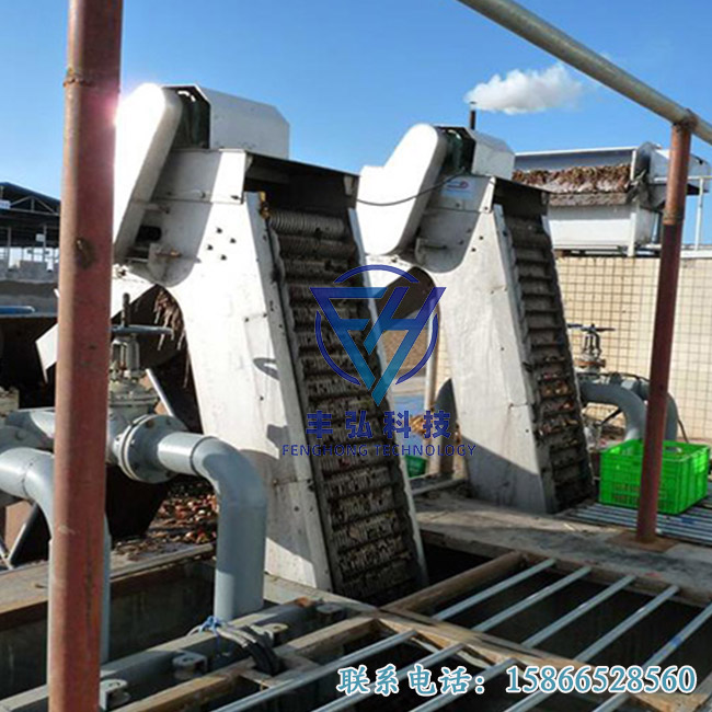 在電機驅動下,通過減速機減速后,帶動鏈輪與鏈條運動,固定在回轉鏈條上除污齒耙鏈條在柵后運動到底部,經(jīng)過導輪后翻轉到柵前迎水面的位置,繼續(xù)運動插入固定柵條的間隙中上行,把柵前攔截的污物提升帶出水面,并隨著鏈條的運動到出渣口處自動翻轉,污物自卸到格柵后的輸送機或渣桶中,完成除污過程,液體則通過柵條的柵隙流過,整個工作狀態(tài)連續(xù)循環(huán)進行。